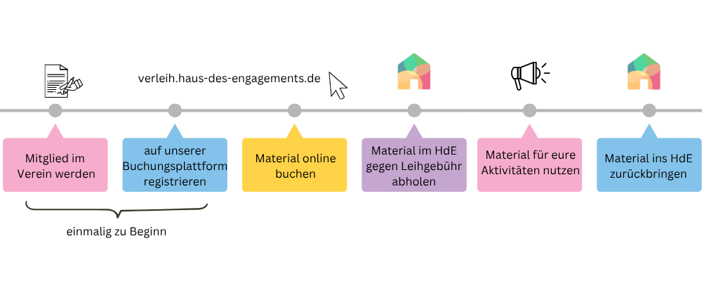 Damit ihr den Materialverleih nutzen könnt, müsst ihr mit eurer Initiative/ Verein Mitglied im Haus des Engagements e.V. sein. Privatpersonen können bei uns keine Gegenstände ausleihen!